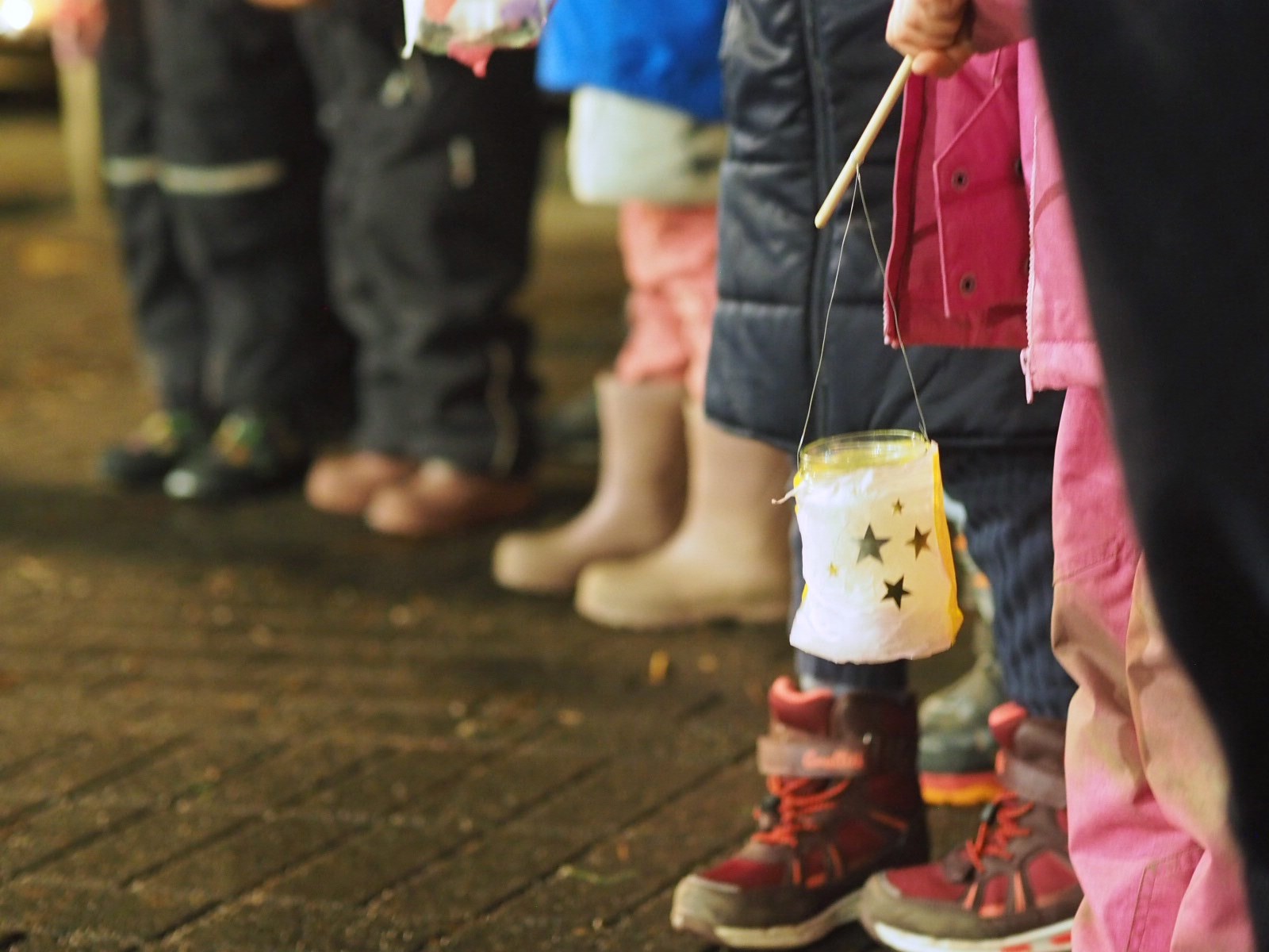 Vi lager lykter og øver på «Lanternesangen», før vi går ut og lar lanternene lyse opp i novembermørket, synger og drikker varm saft.